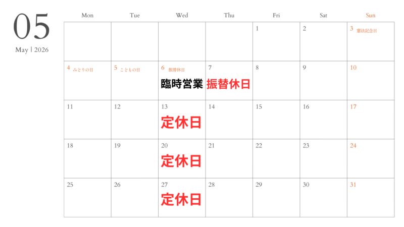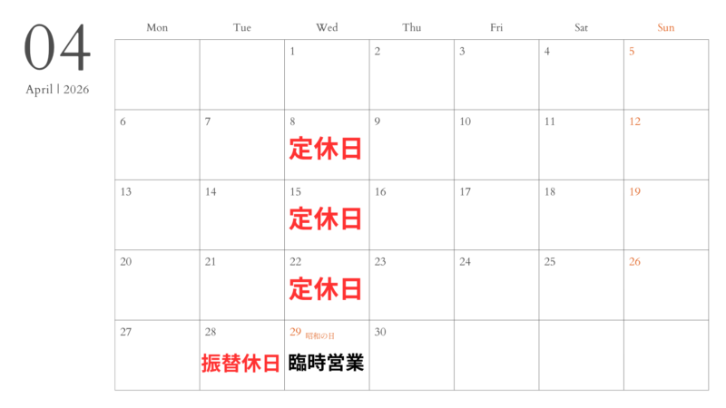 4・5月の営業案内 営業時間のお知らせ 4・5月の営業日のお知らせ 通常水曜日は定休日となっておりますが、 4月29日(水)〜5月6日(水)までGWの為、営業いたします。 振替として、4月28日(火)と5月7日(木)をお休みとさせていただきます。 よろしくお願いいたします。